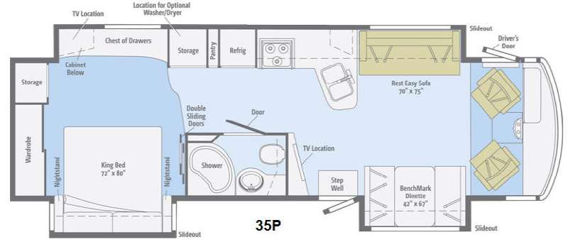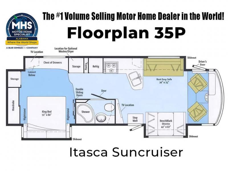 Itasca Suncruiser Triple Slide Class A Coach w/Rear King Bed w/Nightstands Slide, Ward./Storage, Base Cabinet/Chest of Drawers/Storage/Pantry/Refrig./3 Burner Range/Dbl. Kitchen Sink & Rest Easy Sofa Full Wall Slide, BenchMark Dinette Slide, 40" LCD TV, Corner Shower, Vanity, Toilet and More! Shown w/Ford F53 22,000 lb. Specs. Available Options May Include: Ford F53 24,000 lb., BenchMark Dinette w/Extendable Table & Chairs, 4-Door Refrig., Washer/Dryer, TV in Bedroom, Queen Bed.