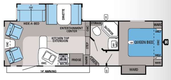 When you enter the 26 5RLS you will be in the rear of the fifth wheel. There are two lounge chairs, a slide with a hide-a-bed and dinette slide, and an entertainment center along one slide. The kitchen area has a counter extension for more space, a double kitchen sink, three burner range, microwave, refrigerator, and pantry.