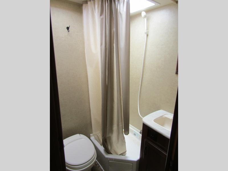 The bathroom is located in the rear. The bathroom has a toilet, corner shower, and sink.