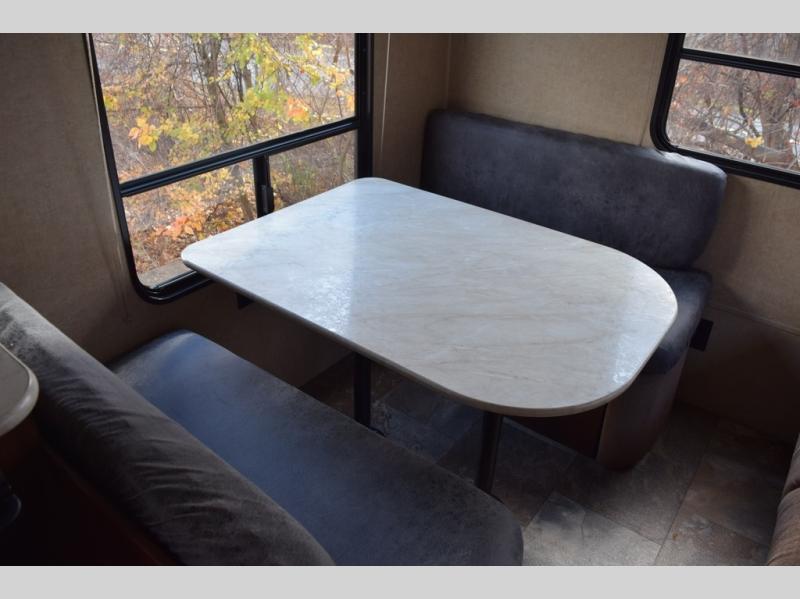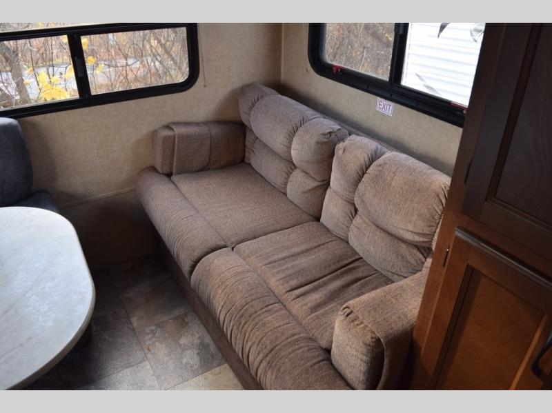 In the rear of the travel trailer you will find a sofa and a dinette.