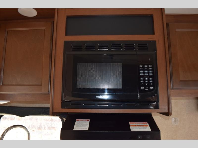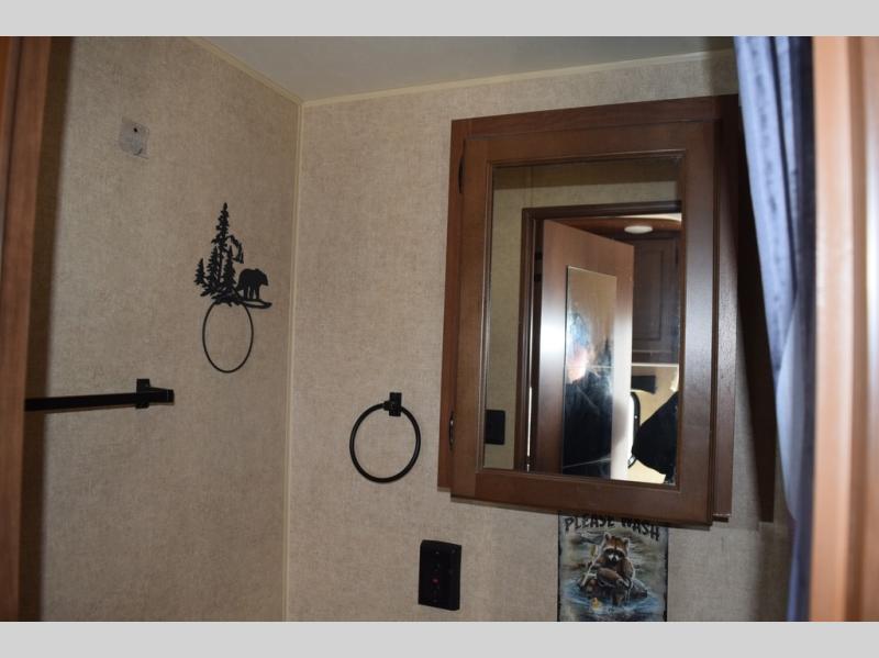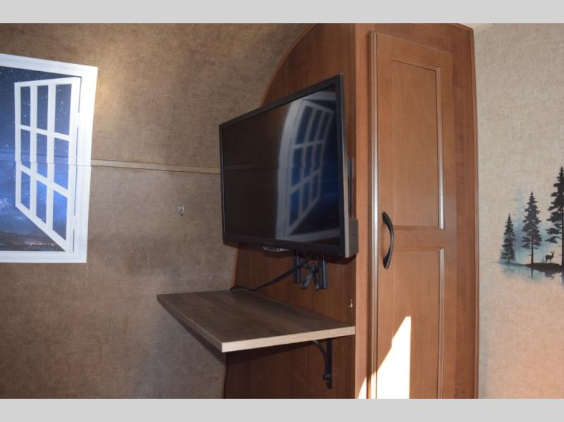 Inside this travel trailer, you will find a queen bed and wardrobe to the right.