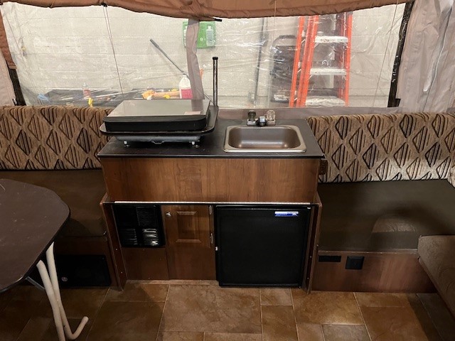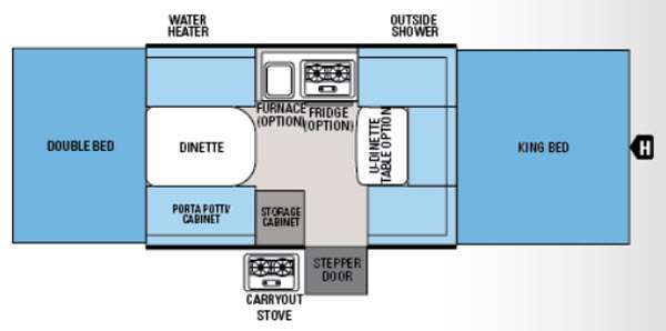 Outside there is a carryout stove and an outside shower. You can even choose a few options, such as, a furnace and a refrigerator.