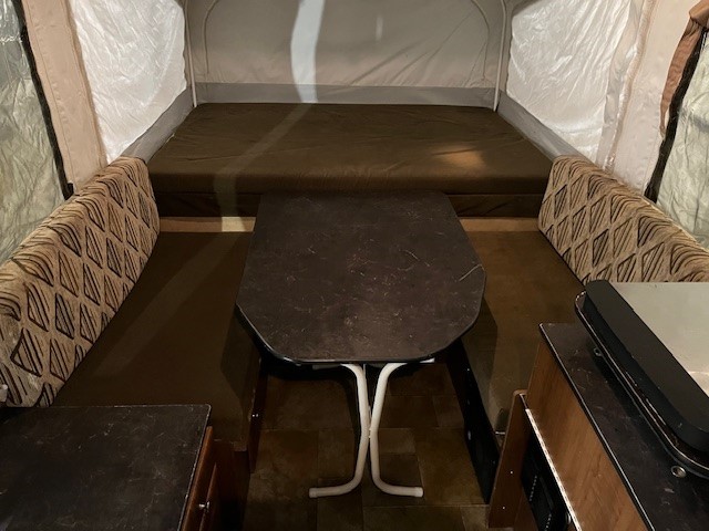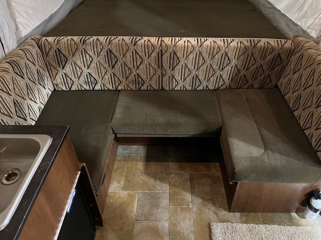 To the left of the entrance is a storage cabinet, and porta potti cabinet. To the right of the entrance is a u-dinette.