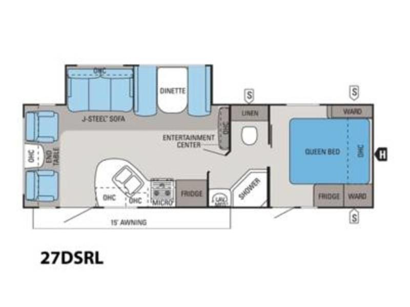 The 27DSRL White Hawk travel trailer by Jayco offers a rear living area and single slide.