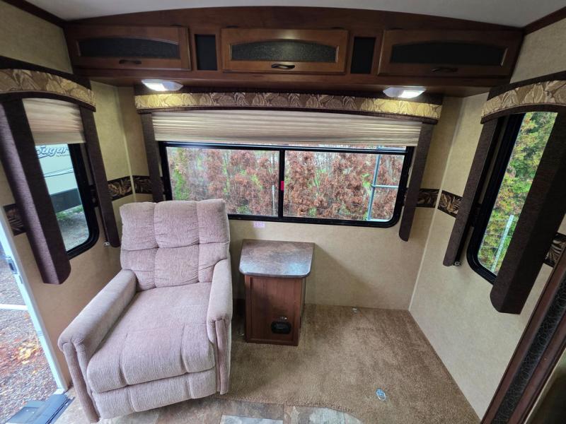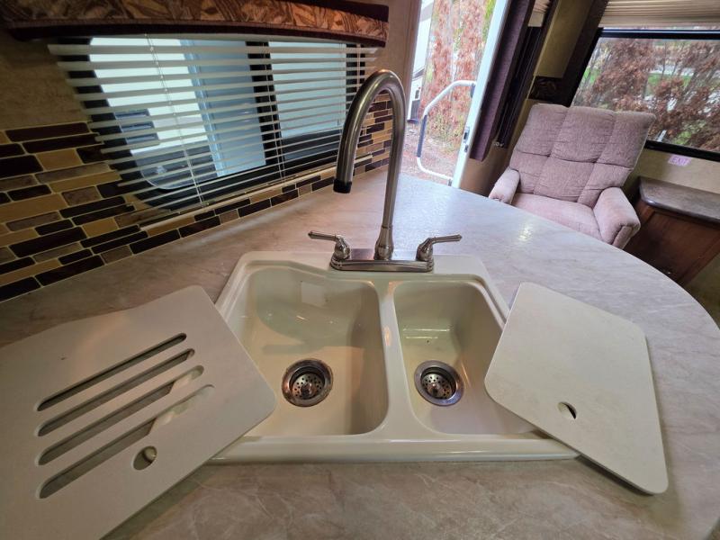 Stepping inside the rear of the travel trailer, there are two lounge chairs and an end table. The slide has a sofa and dinette. Along one wall you will find an entertainment center. The opposite side of the travel trailer has a double kitchen sink, three burner range, microwave, and refrigerator.