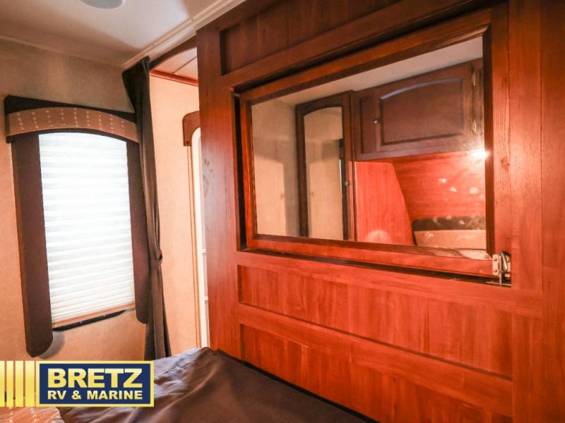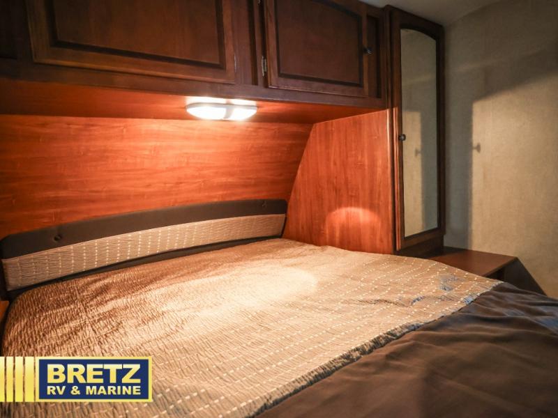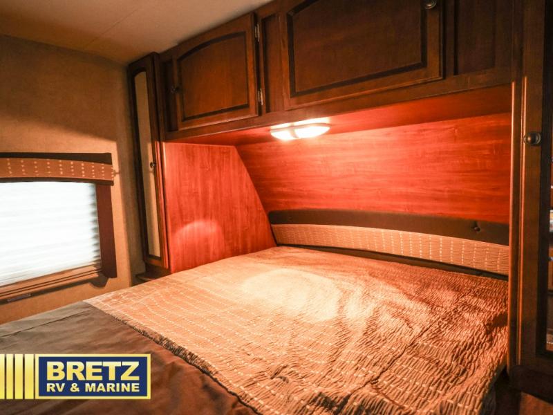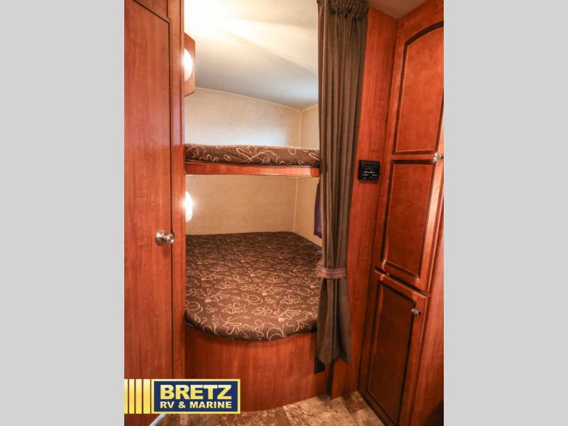 What I liked most: Master bedroom has two sliding pocket doors for privacy, large wardrobes on both sides, and storage up above, and a little extra cubbie hole area on each side of the bed as a nightstand different than I've seen in any other RV. Roomy double bunk beds each having their own electrical outlet, window, shelf, and light. Skylight above the kitchen is a very nice touch for extra light.