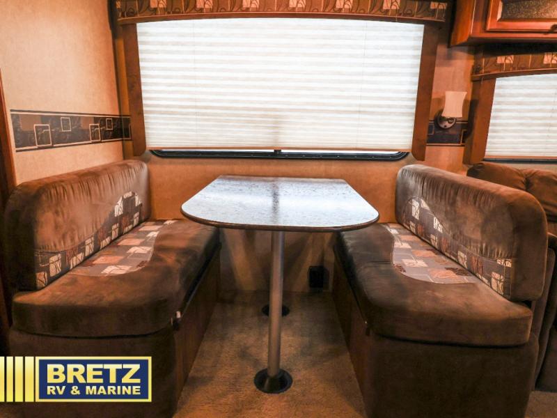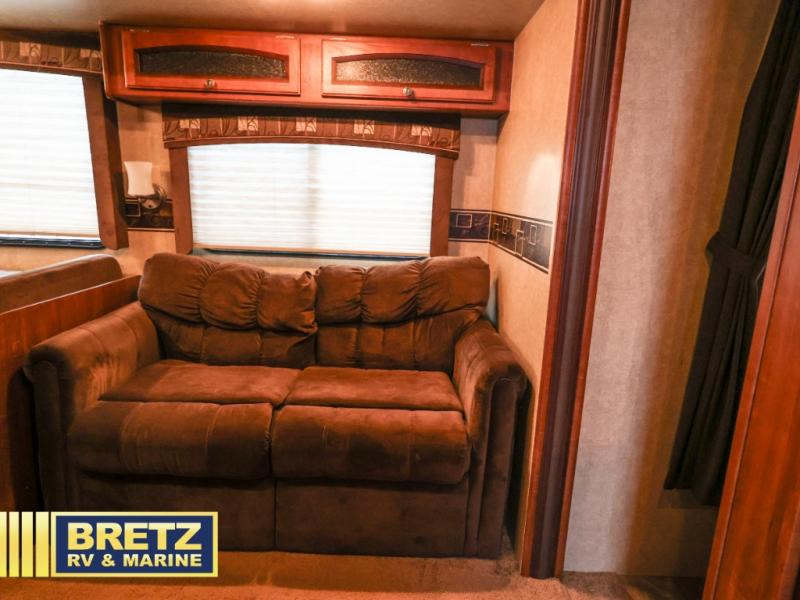 The main living area has a slide with a sofa and dinette. Along one side is an entertainment center for your enjoyment. You will also find a double kitchen sink, three burner range, microwave, refrigerator, pantry, wardrobe and additional pantry.