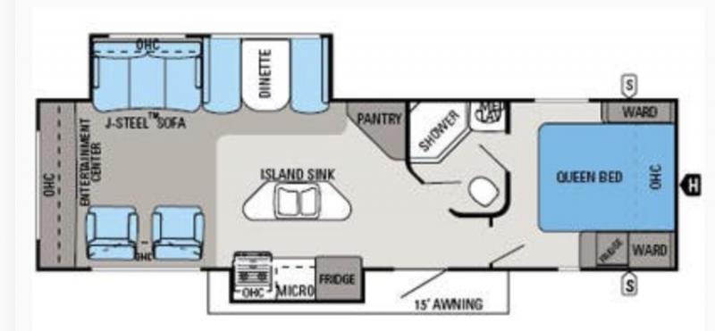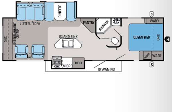 As you enter the travel trailer, to the left is a slide with a refrigerator, microwave, and three burner range. The kitchen island has a double kitchen sink. In the corner you will find a large corner pantry. The opposite side has a slide with a dinette and sofa. Along the rear wall is an entertainment center. You can also enjoy relaxing in the two lounge chairs.