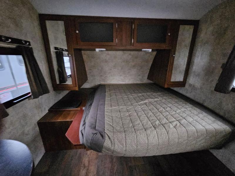 The very front of 204RBS features a comfy queen bed with wardrobes on both sides of the bed. There is an overhead cabinet and a laundry chute, plus front pass-through storage, and so much more!