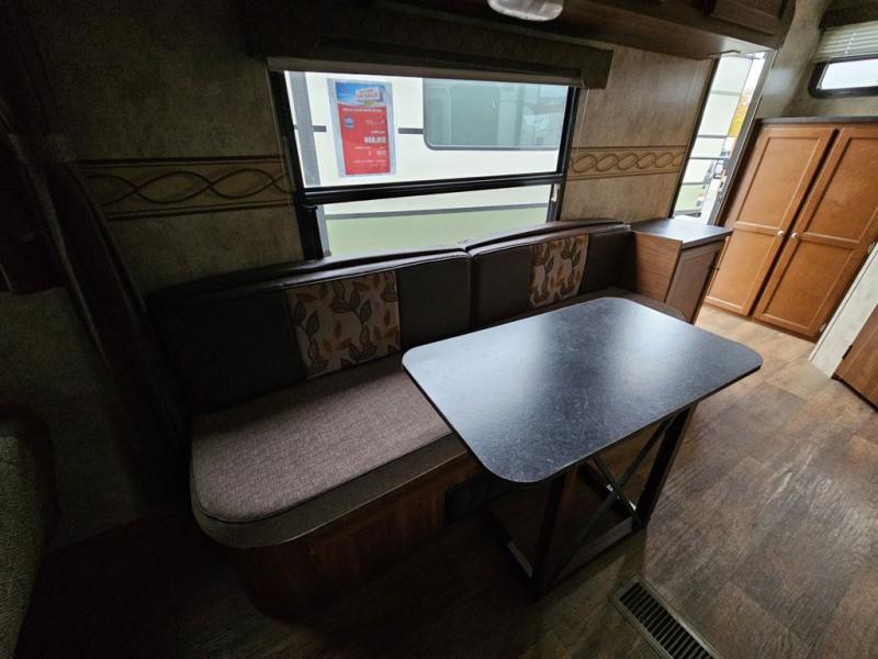 Moving to the center of the trailer you will find an ample kitchen including; a refrigerator, 3 burner range, and double kitchen sink. There is also plenty of overhead storage for dishes and things. Across from the kitchen is a booth dinette with overhead storage also.