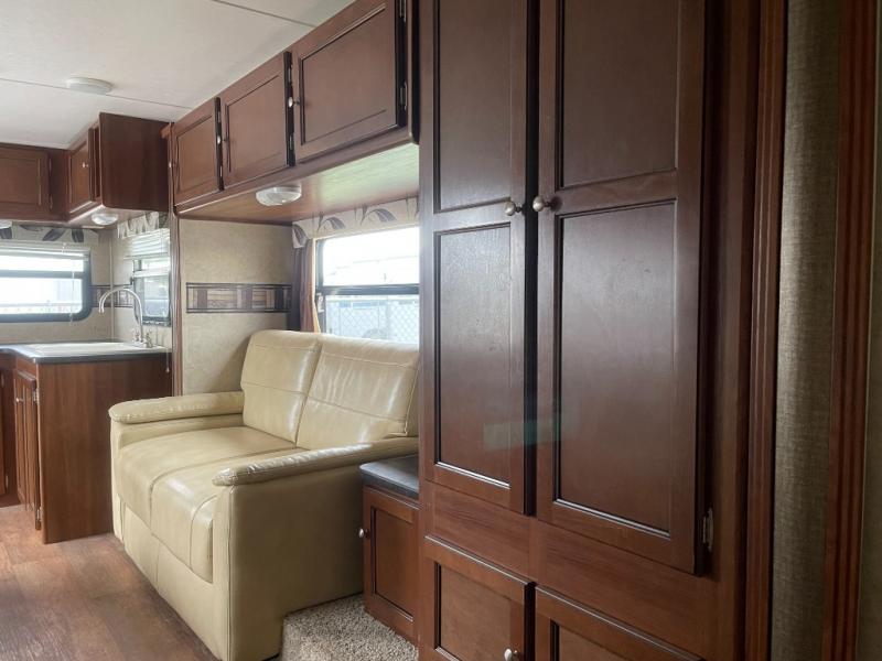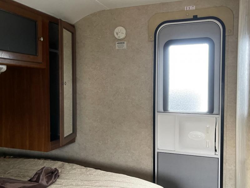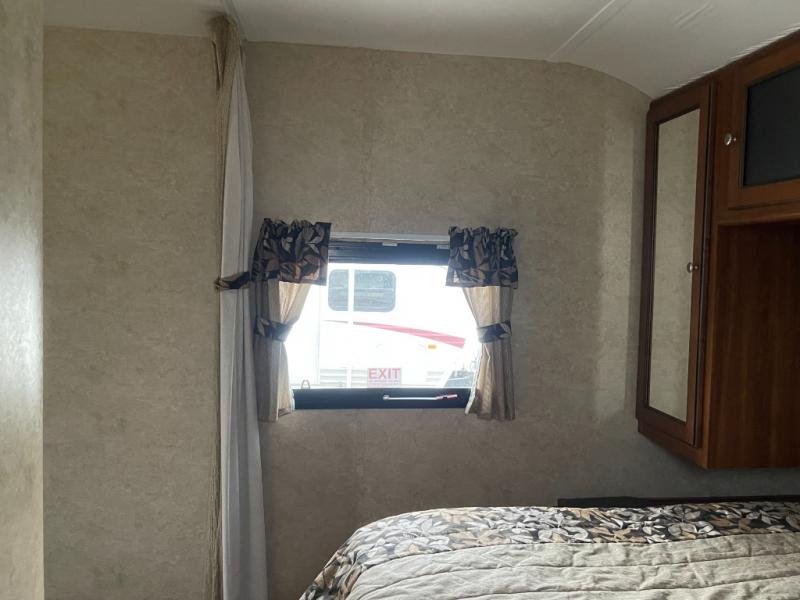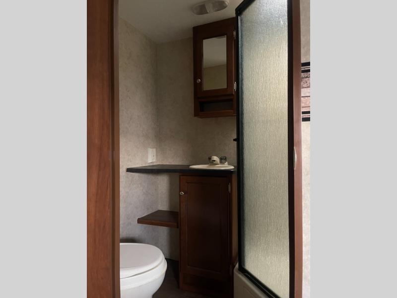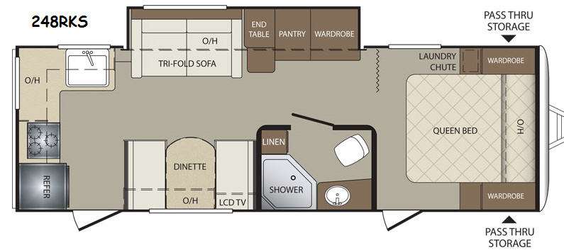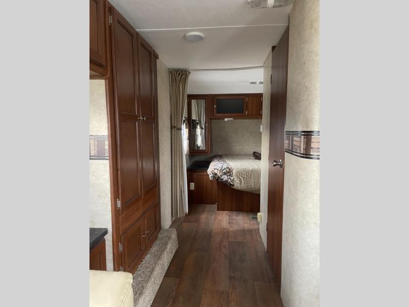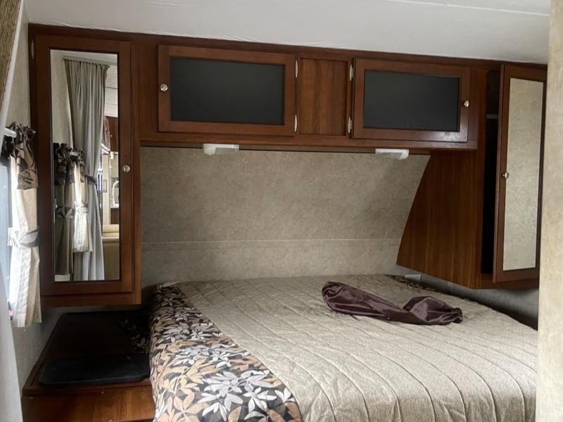 All the way to the front of this Bullet 248RKS is a comfy queen bed with wardrobes on either side of the bed, along with a laundry chute and an overhead cabinet for more storage. There is also a private bedroom entry door for your convenience.