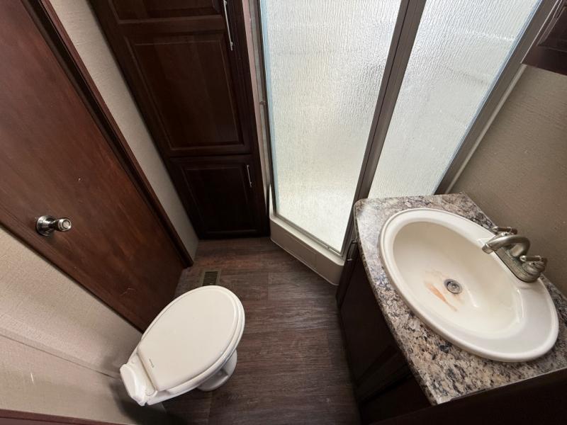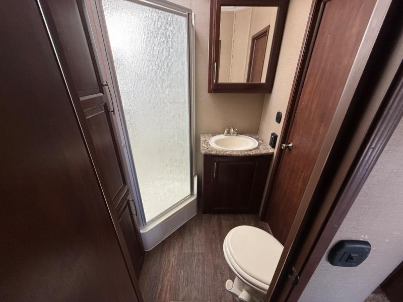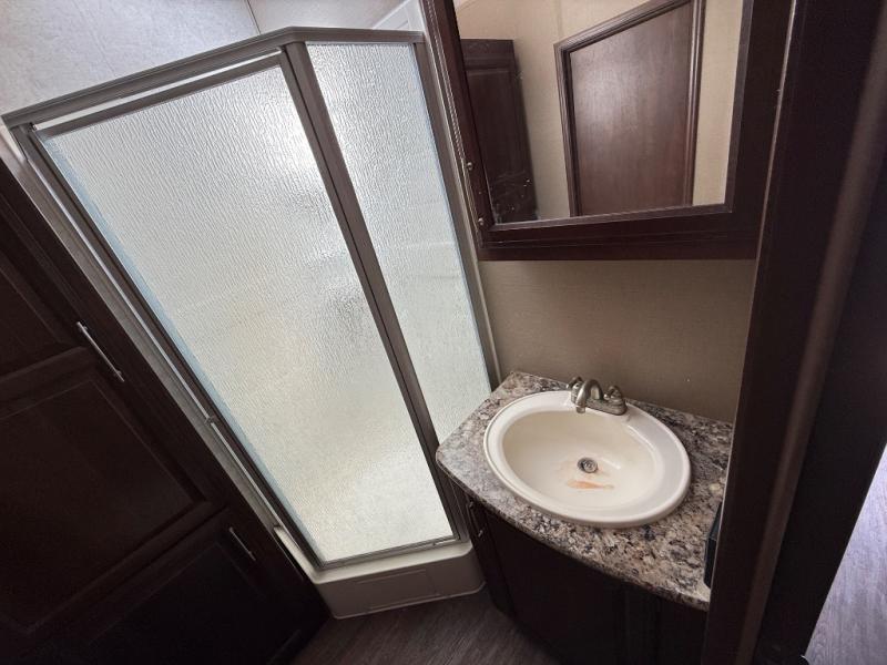 Move to the rear of this fifth wheel and find a full bath with toilet, sink, neo-angle shower, and linen cabinet.