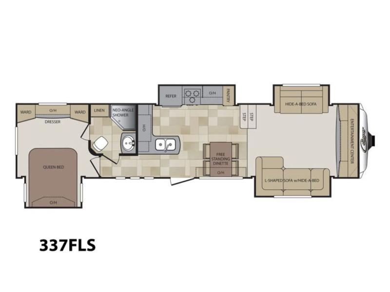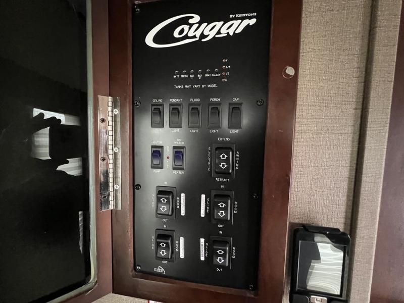 This Cougar fifth wheel 337FLS by Keystone RV features quad slides, a front living area, and rear master bedroom.