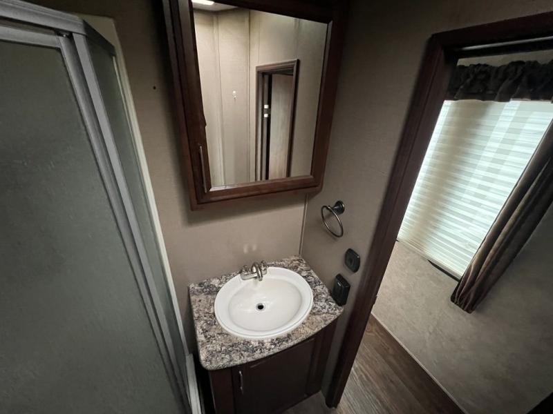 Move to the rear of this fifth wheel and find a full bath with toilet, sink, neo-angle shower, and linen cabinet.