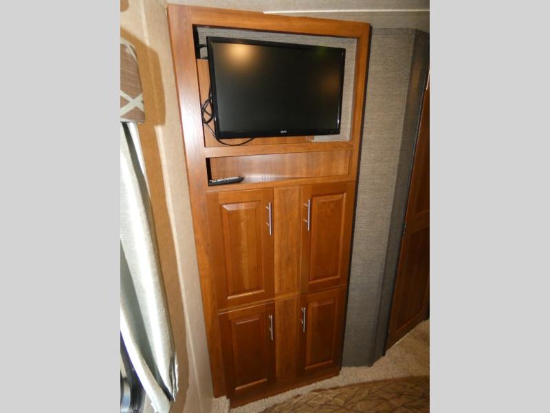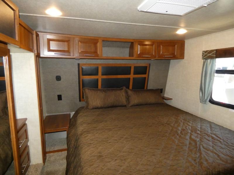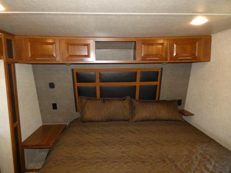The bedroom features a relaxing retreat with plenty of space to move around. There is a residential queen size bed. You will also find plenty of storage with the wardrobe and dresser slide-out, plus there are overhead cabinets above the bed and along the side of the bed also.