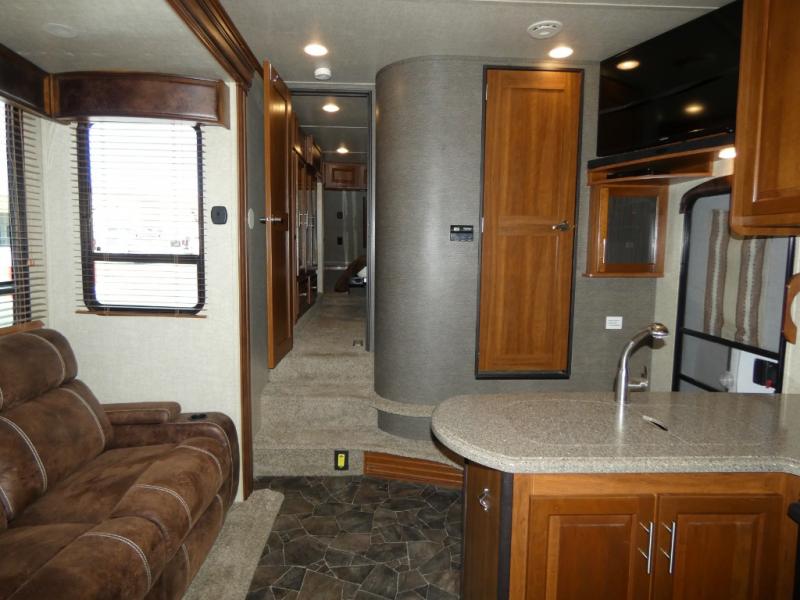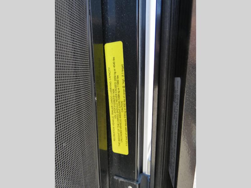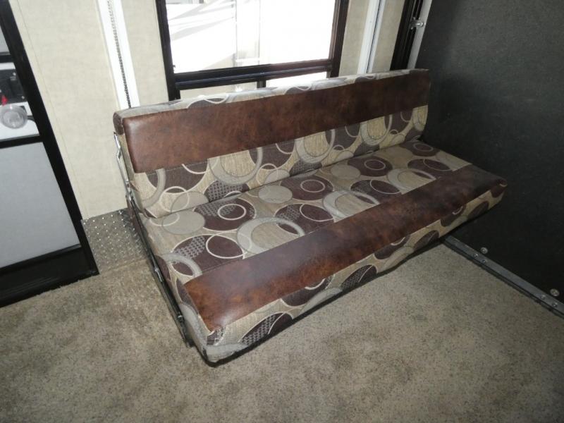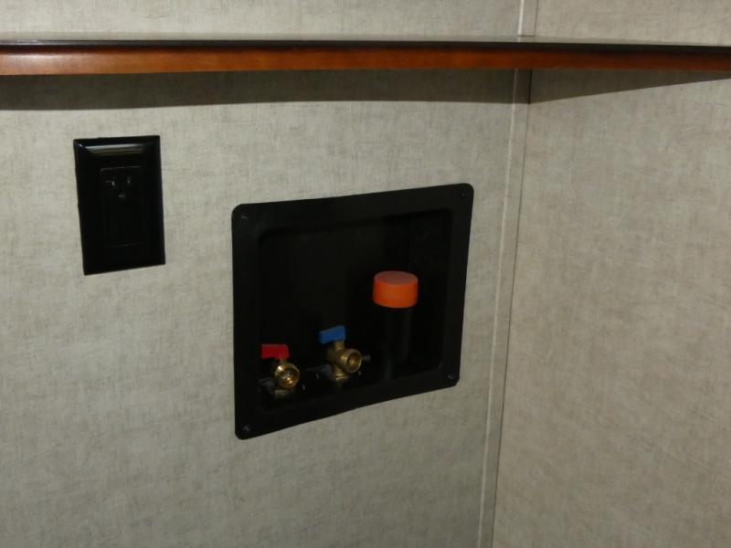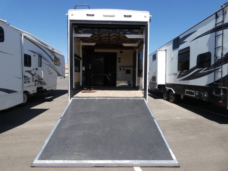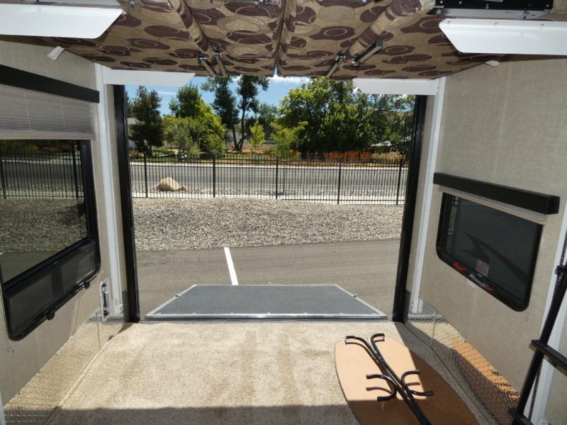 Inside there is a 10' cargo space to easily haul your toys in, with tie downs to make things secure. Load things using the rear 8' ramp door. There is a large overhead cabinet for storage above the glass sliding doors. There is also a washer/dryer prepped space with overhead cabinet just to the right of the side man cargo door. Once you reach your destination and the cargo is removed there is much added living space to enjoy.
