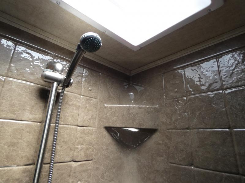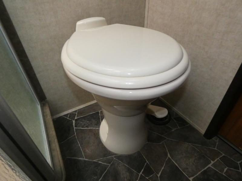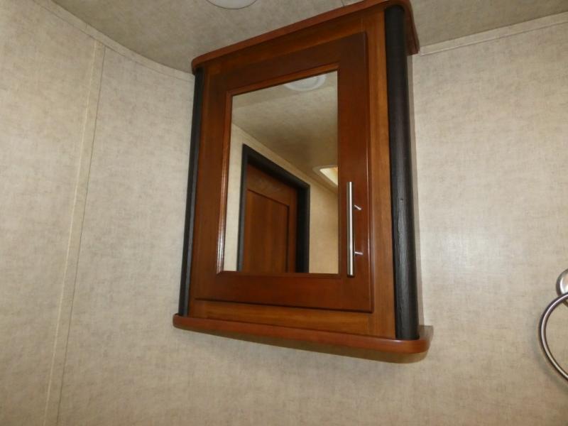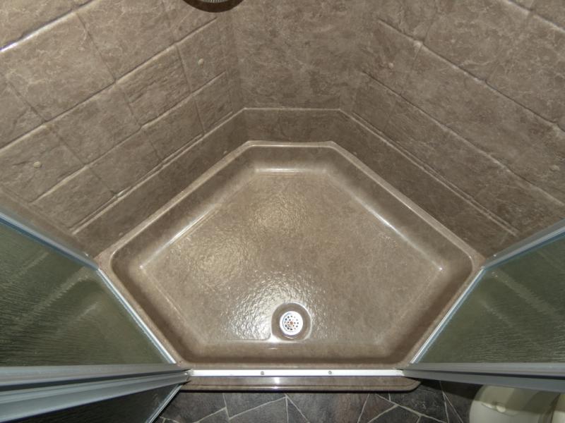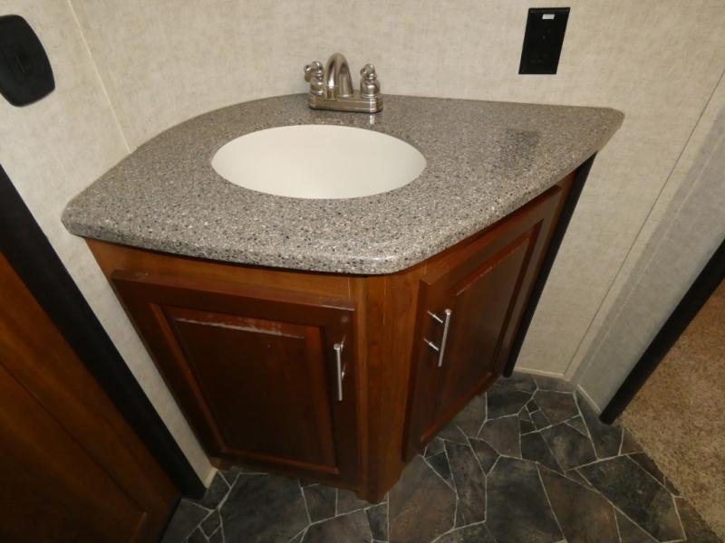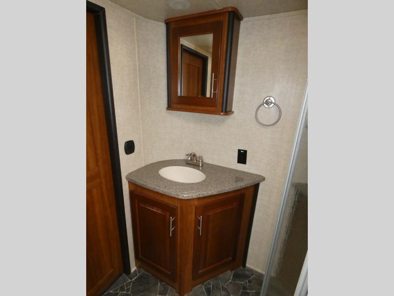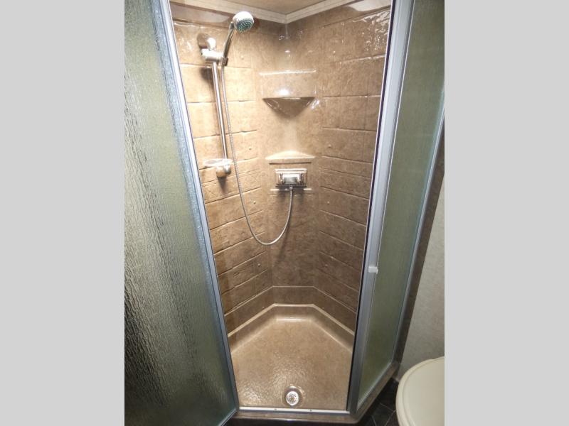 There are dual entry steps up to a bed and bath area. The steps closest to the main entry take you into the bath which features an angled shower, toilet, and sink. There is a second door that leads right into the front bedroom, or you can take the second set of steps along the dinette wall to a door at the top of the steps.