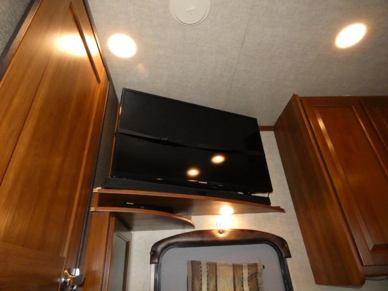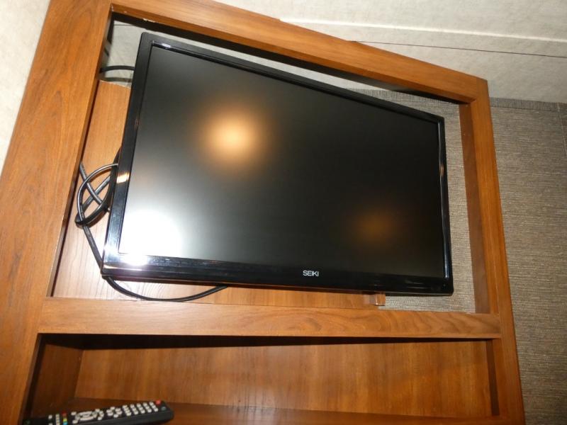 Above the side entry door there is an LCD TV for enjoyment that can easily be viewed from the sofa on the other side of the room.