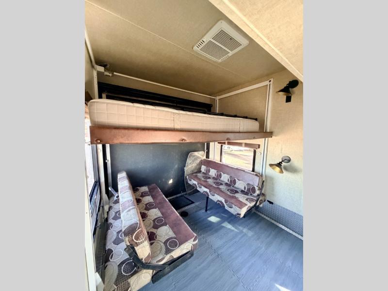 Through the glass patio doors in the cargo area you enter the combined kitchen and living space featuring a large slide-out sofa on one side, and a second slide with 12 cu. ft. refrigerator and three burner range opposite. There is also an entertainment center for your enjoyment, a center kitchen island with a double sink, and plenty of counter space.