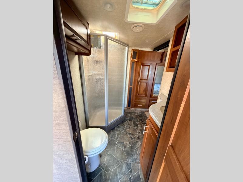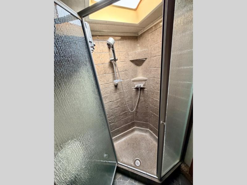The bath provides an angled shower, toilet and sink. It also has dual entry doors.