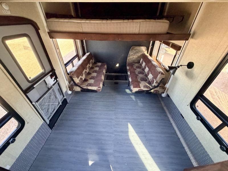 The rear ramp 8' garage door opens up to a 11' garage area that is perfect for hauling your toys. There are optional dual opposing sofas that are great for hanging out, and a top queen bed for sleeping, plus a 40" loft at the front of the cargo that overlooks the interior of the unit. There is also an LCD TV in the cargo space, washer dryer prep, plus a side man door.
