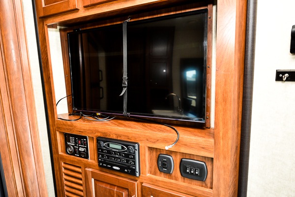 The front bedroom features a residential queen size bed, TV hookup, wardrobes on both sides of the bed, overhead cabinet, and so much more!