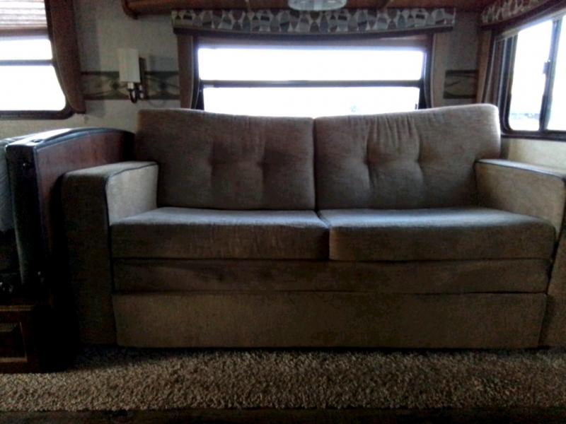 Opposite the door side is a sofa sleeper and booth dinette slide out. This slide actually continues into the rear bunkhouse behind a sliding pocket door.