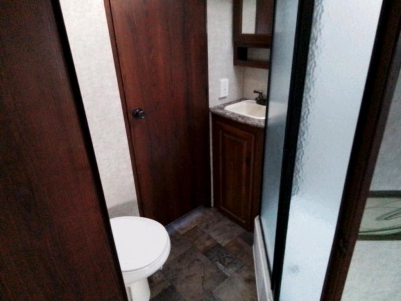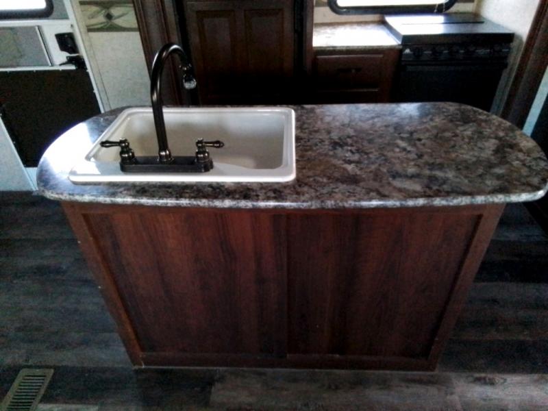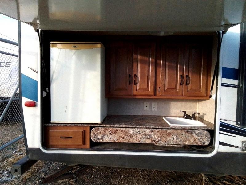 Before you enter notice the outside kitchen which is perfect for cooking and eating outside. There is a refrigerator, single kitchen sink, flip-out stove top, and bumper mount grill. You will also appreciate the storage that can be found in the front pass-through compartment.
