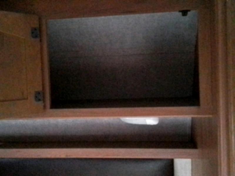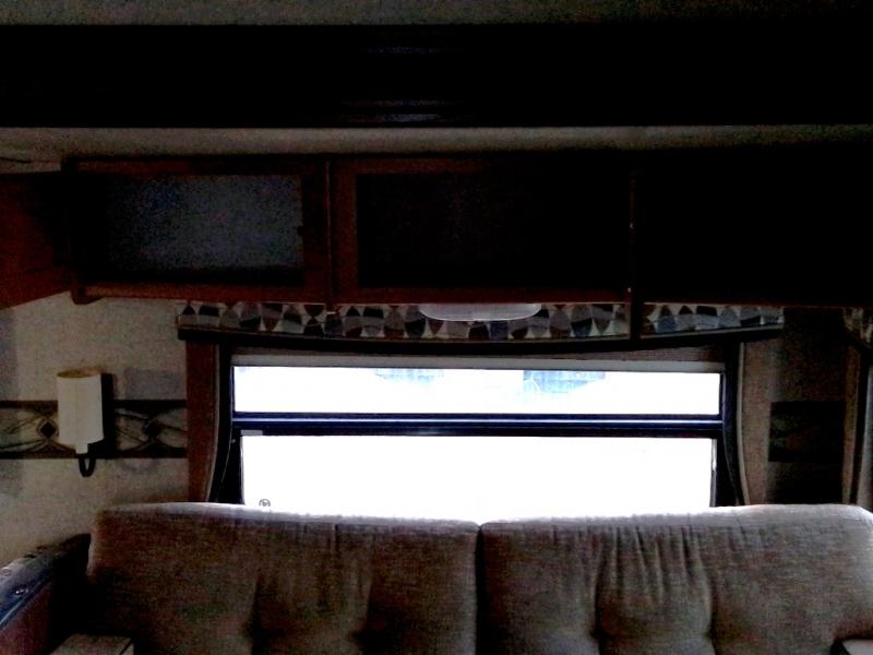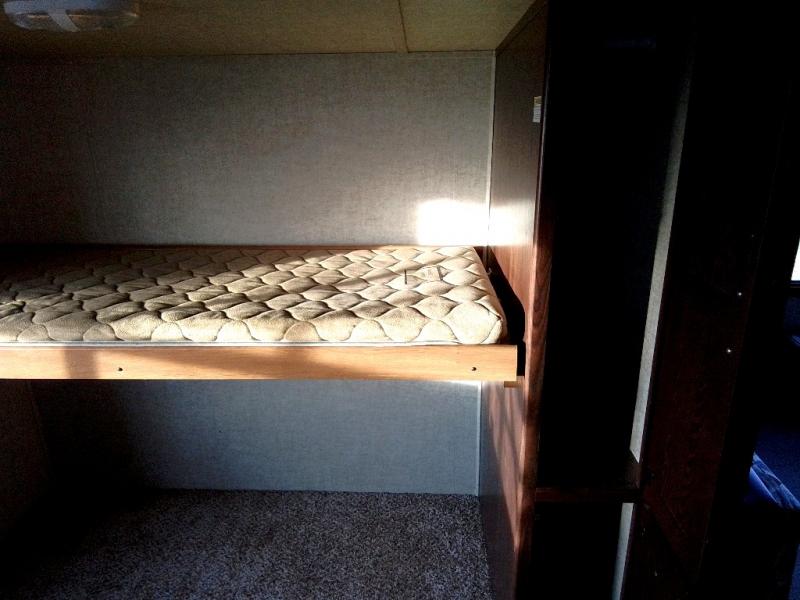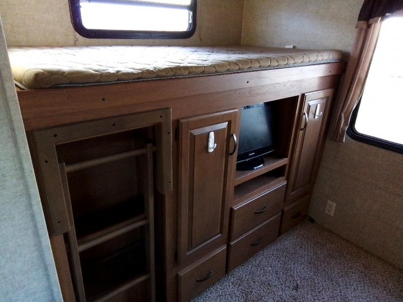 Inside the bunkhouse you will find a sofa sleeper with bunk above and wardrobe that are all part of the large living area slide. On the left side there is a second bunk above an entertainment center with storage.