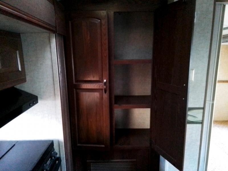 Next, step inside and be greeted by a spacious interior with a super large curbside slide and kitchen slide to the left of the door. There is an entertainment center to your immediate right as you enter. To the left find a refrigerator, and three burner range slide. A floor to ceiling double door pantry is located just off the slide. The kitchen island provides a bit more counter prep space, plus it is the location of the double kitchen sink.