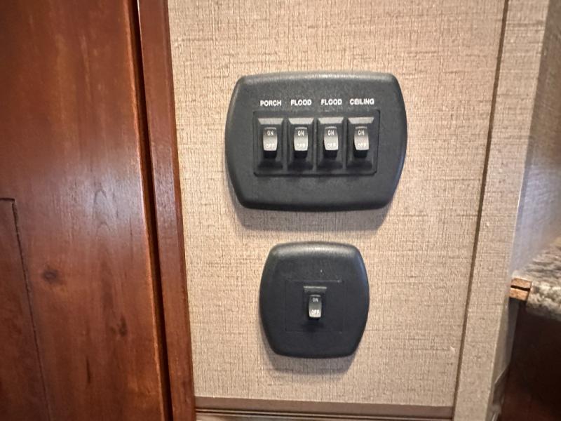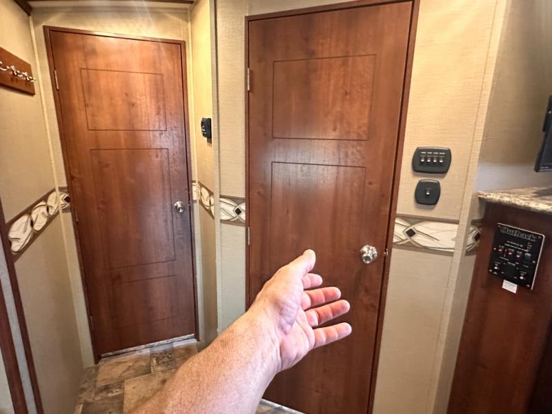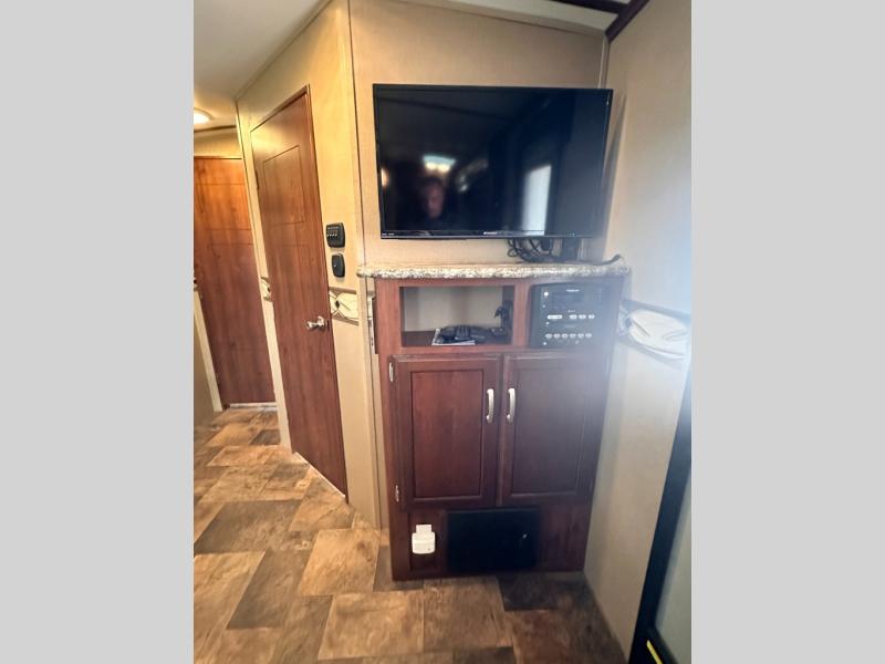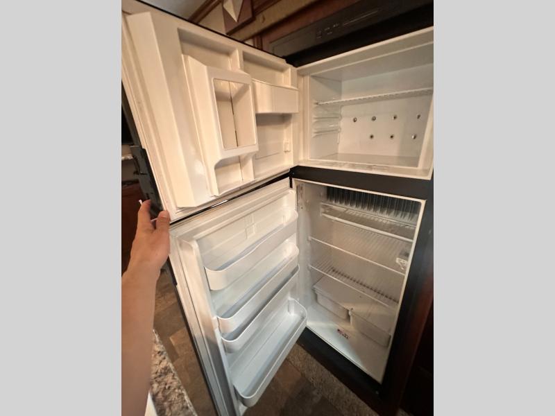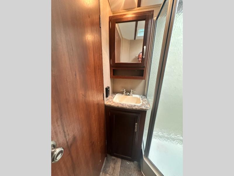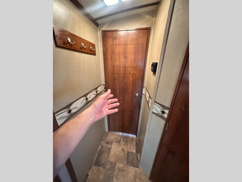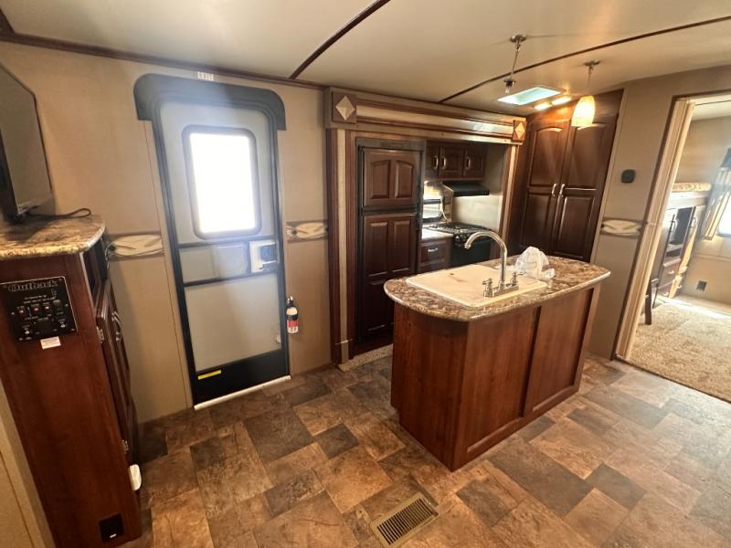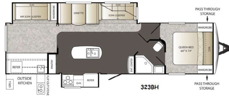 Before you enter notice the outside kitchen which is perfect for cooking and eating outside. There is a refrigerator, single kitchen sink, flip-out stove top, and bumper mount grill. You will also appreciate the storage that can be found in the front pass-through compartment.