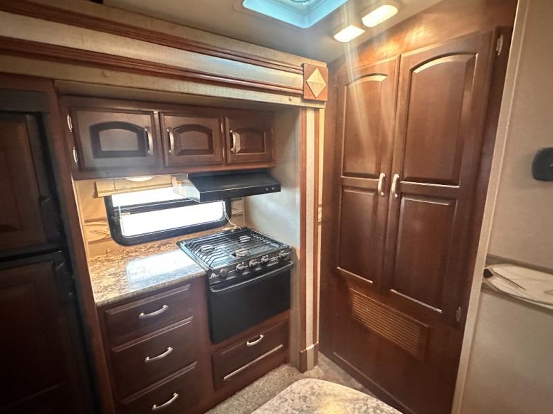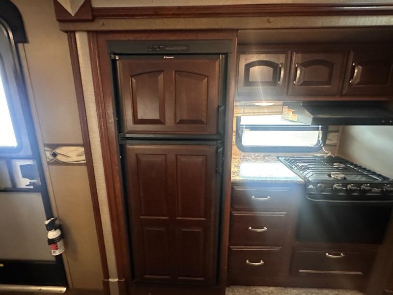 Next, step inside and be greeted by a spacious interior with a super large curbside slide and kitchen slide to the left of the door. There is an entertainment center to your immediate right as you enter. To the left find a refrigerator, and three burner range slide. A floor to ceiling double door pantry is located just off the slide. The kitchen island provides a bit more counter prep space, plus it is the location of the double kitchen sink.