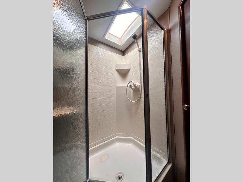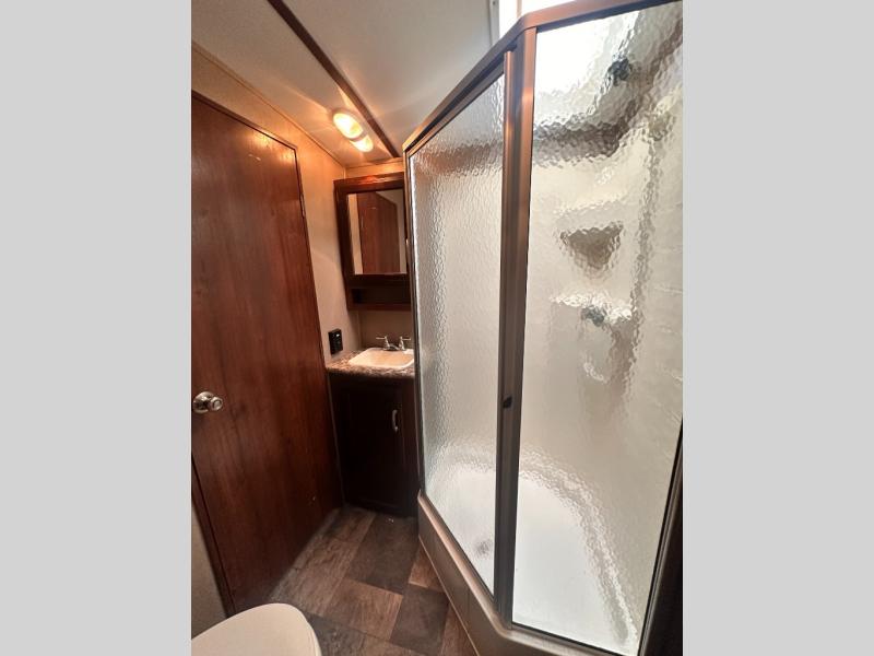 Head back through to the front where you will find a complete bath including an angled shower, toilet and sink. There is also a private second door that leads into the front master suite.