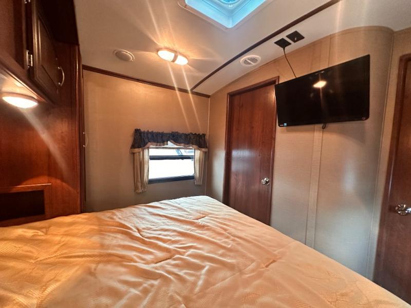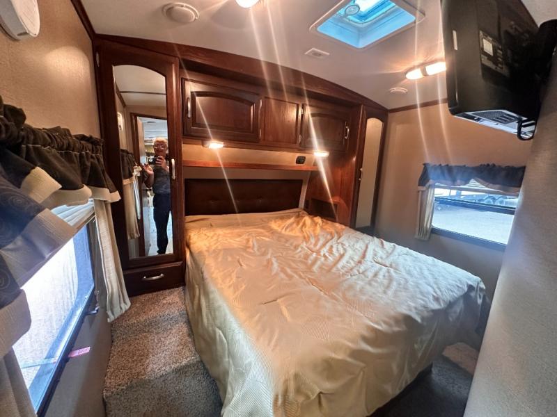 The front bedroom offers a queen size bed with dual bedside wardrobes, overhead cabinets, and so much more!