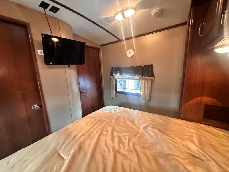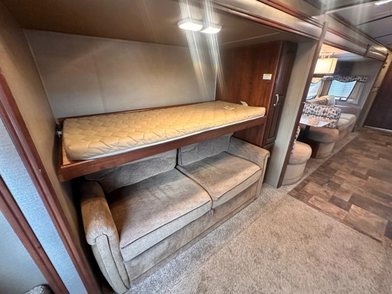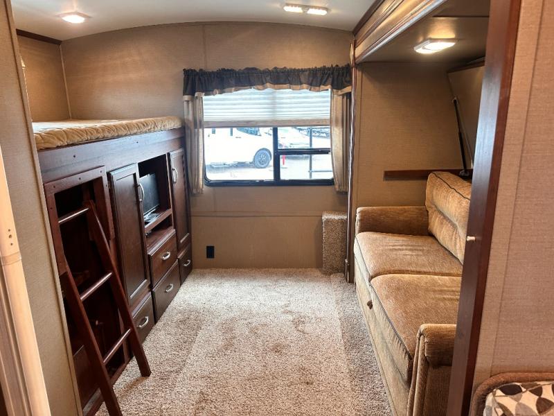 Inside the bunkhouse you will find a sofa sleeper with bunk above and wardrobe that are all part of the large living area slide. On the left side there is a second bunk above an entertainment center with storage.