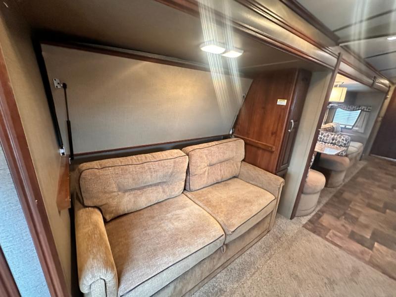 Opposite the door side is a sofa sleeper and booth dinette slide out. This slide actually continues into the rear bunkhouse behind a sliding pocket door.