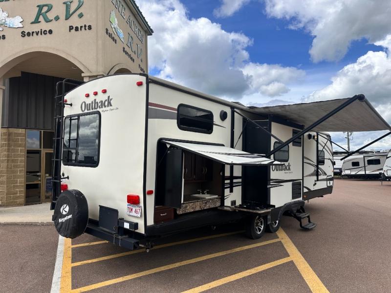 Step inside this Keystone Outback travel trailer model 323BH which offers a spacious interior due to a super large side out. There is a second smaller slide, a convenient kitchen island, and bunkhouse for the kids.