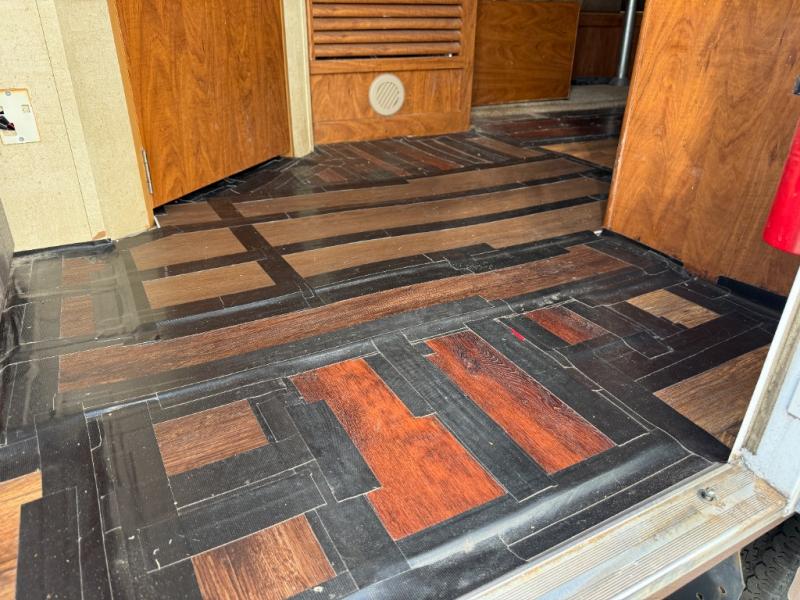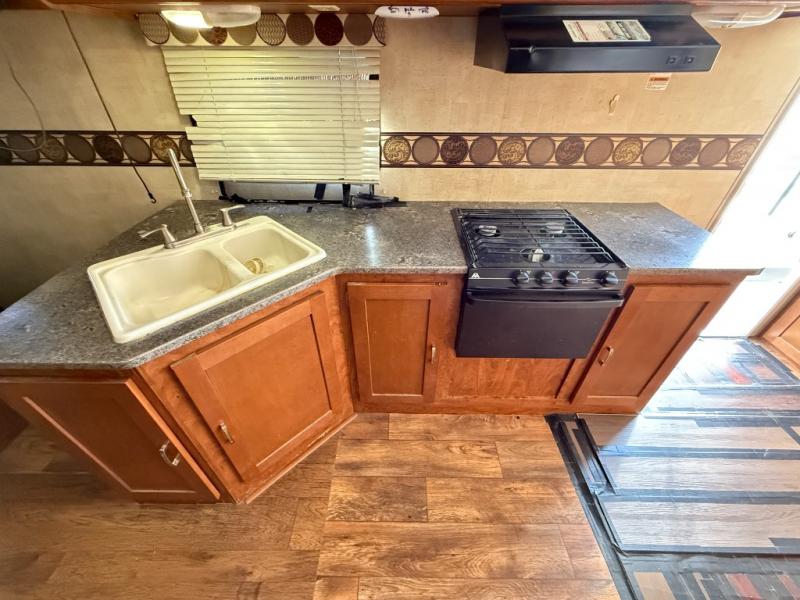Just outside the bathroom door is where you will find the refrigerator to keep things cold and fresh. Across the way find a counter area, three burner range, and a double kitchen sink which makes cleanup a cinch. The overhead storage cabinet is perfect for organizing all of your dishes and things.