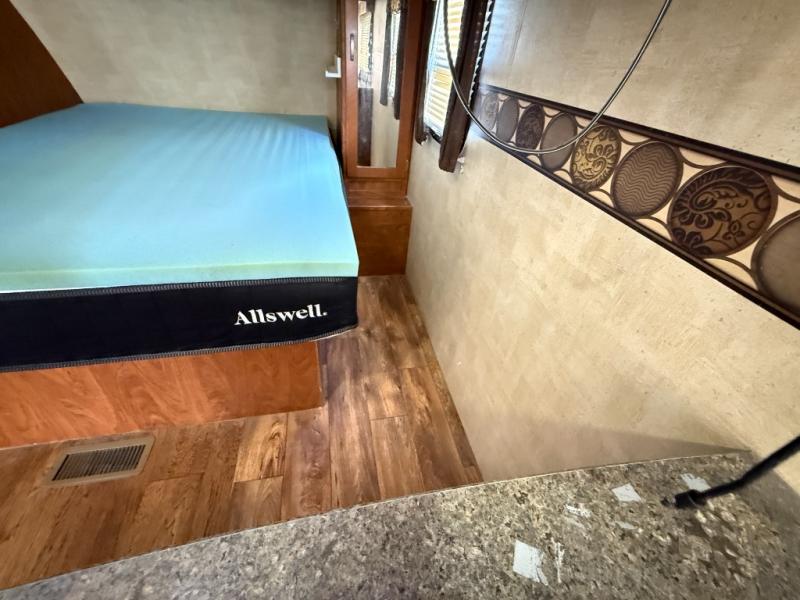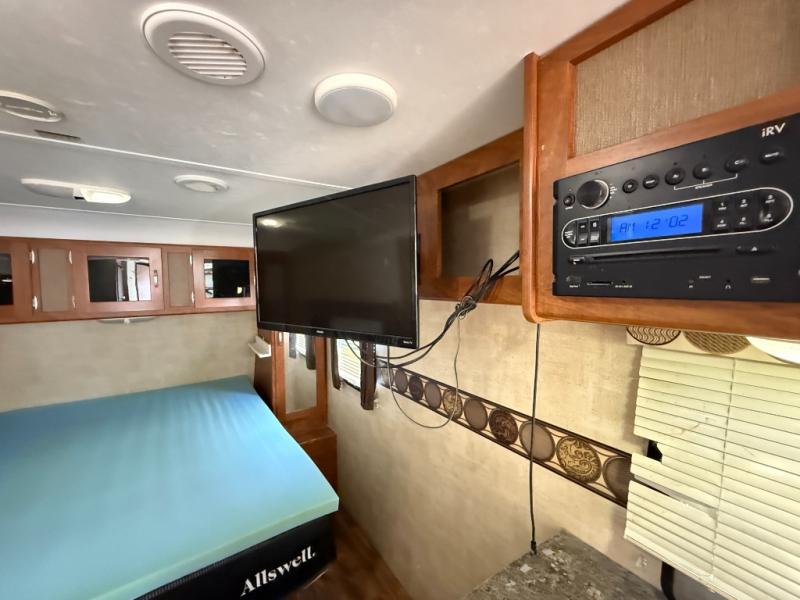 The front features a queen size bed with dual wardrobes and an overhead storage cabinet. There is a TV that can easily be viewed from the bedroom or the dinette.