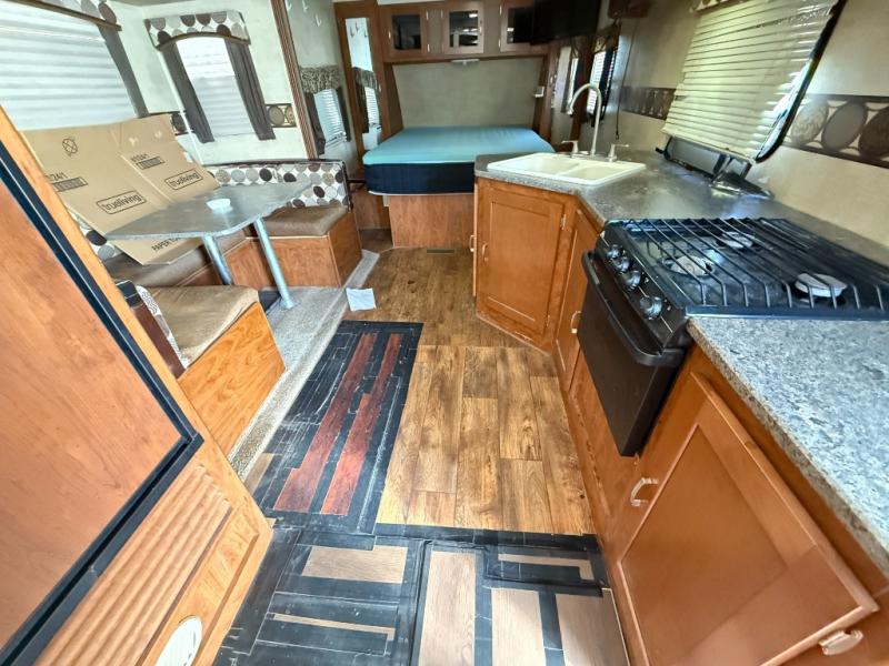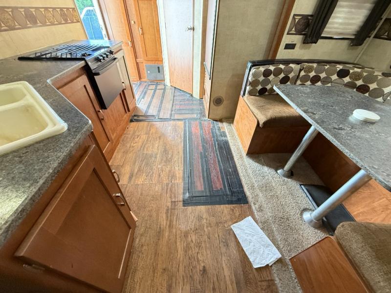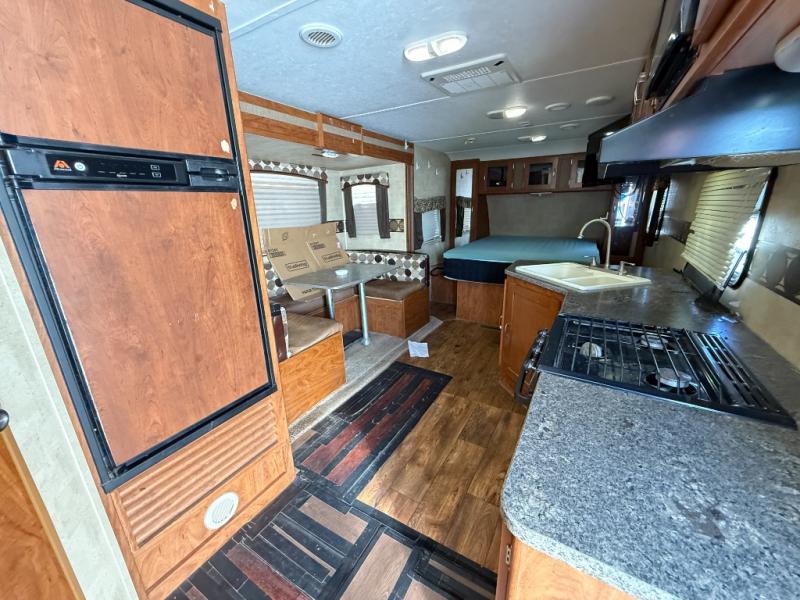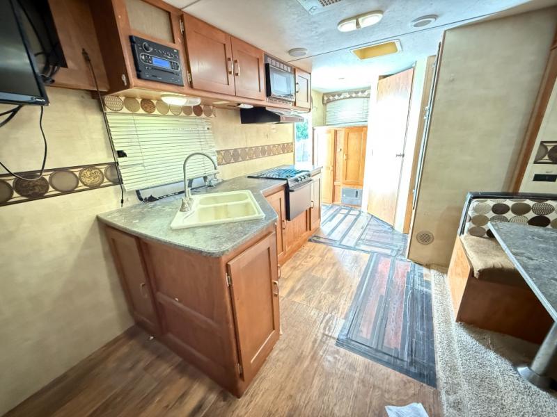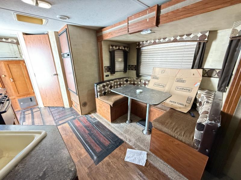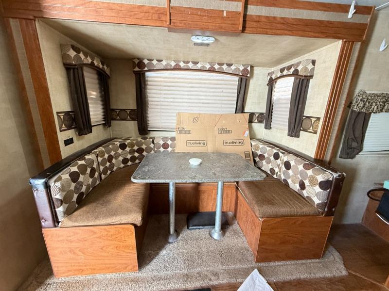Opposite the kitchen area find a slide out u-shaped dinette which creates a bit more foot traffic space inside, plus the dinette can easily seat everyone for mealtime, and also can become a bed for two at night.