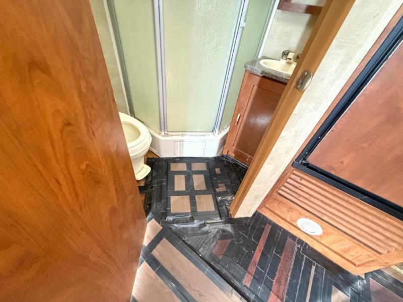 The bathroom is straight ahead and features a angled shower, toilet, and sink.