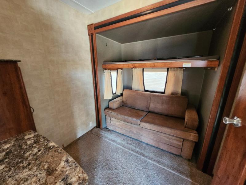 Enjoy eating your meals at a free standing dinette in the slide-out opposite the patio doors that also includes a tri-fold sofa sleeper with overhead storage. An entertainment center can be found along the interior living area wall featuring a flat screen LCD TV.