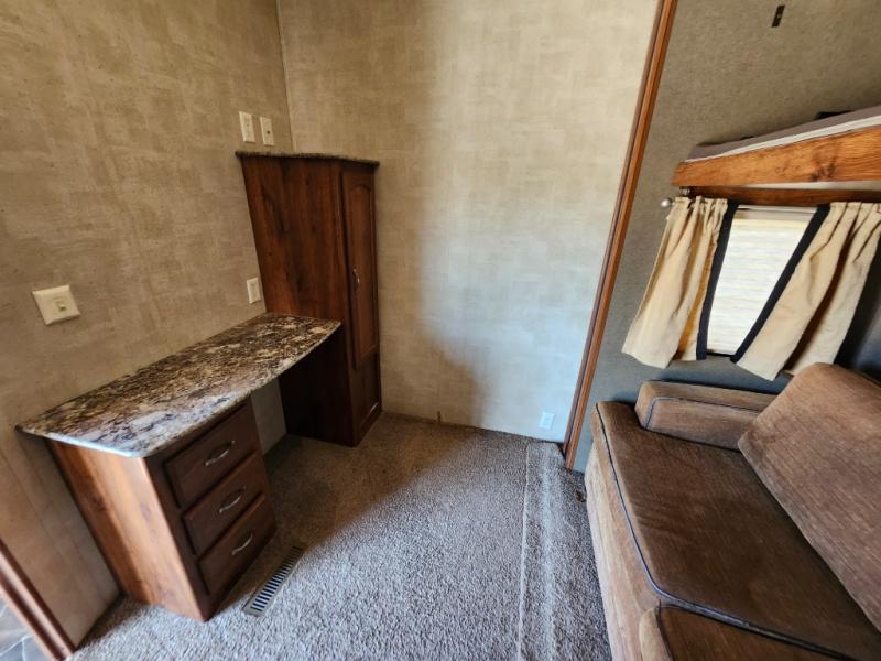 The rear bedroom provides a quiet space with a queen bed slide including overhead storage. There is also a nightstand, armoire, and vanity with drawers for clothing, and so much more!