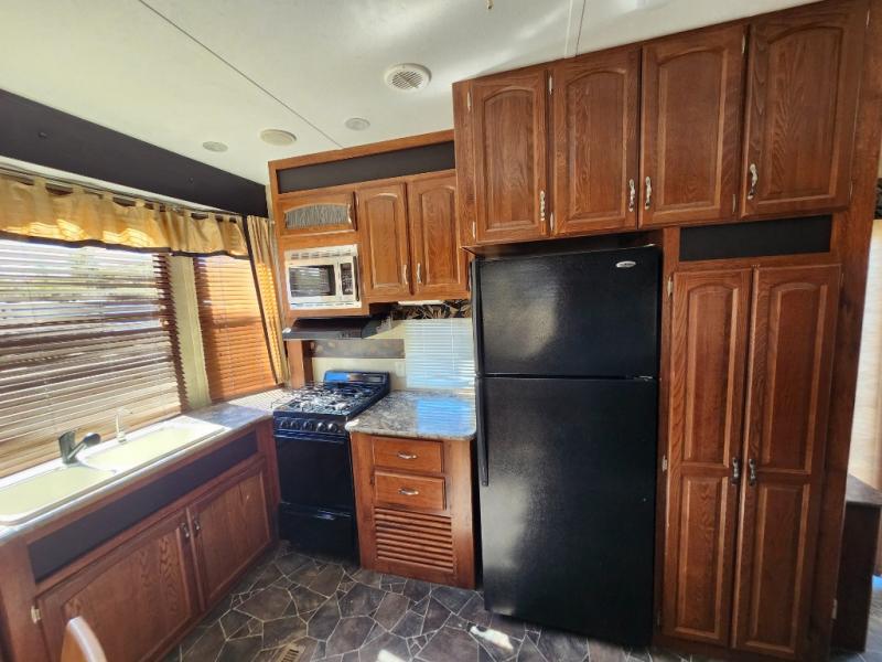 Step inside the glass patio doors and see a wide open spacious front kitchen and living room area. There is a large pantry to the right of the door followed by a residential refrigerator, and counter space with four burner range. The counter continues around front and includes a double kitchen sink with prep space on either side, plus plenty of overhead storage for all of the things you might need in preparing your favorite meals and snacks.