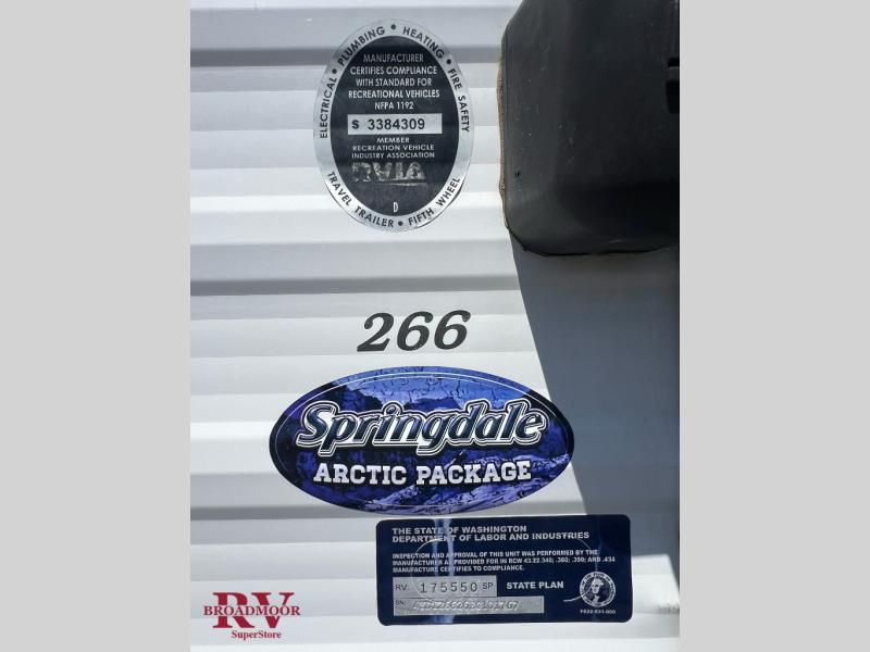 Camp comfortably in this Keystone Springdale travel trailer model 266RLSSR featuring double entry doors, a rear living area layout, and a large slide for added interior space.