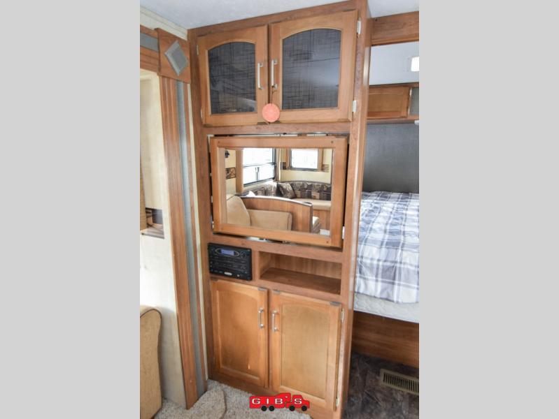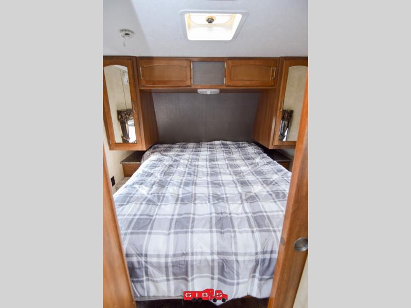 Step inside and notice the private front bedroom with sliding door. Inside there is a queen size bed, plus nightstands on either side of the bed with storage closets above. You will also enjoy the overhead cabinets too.
