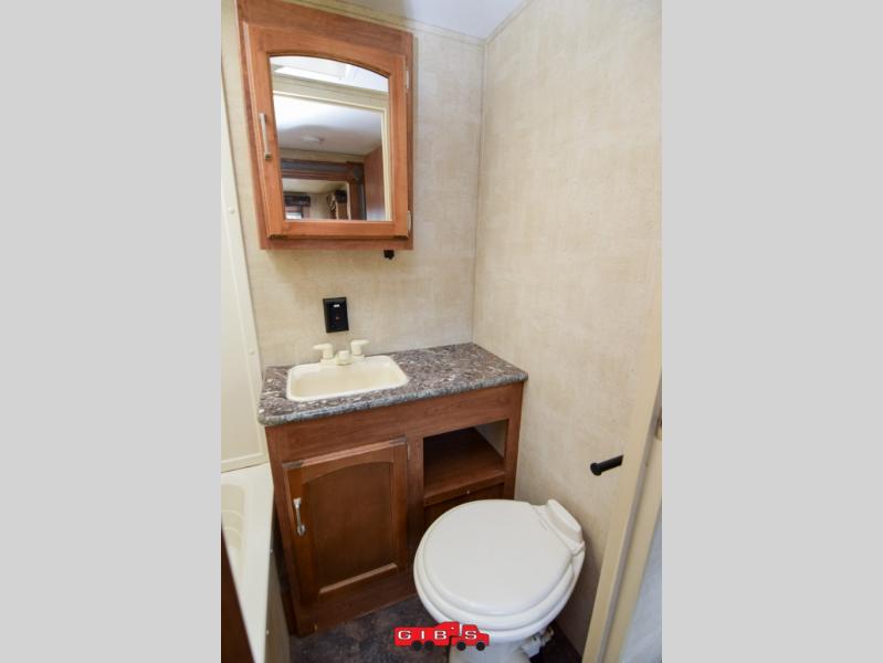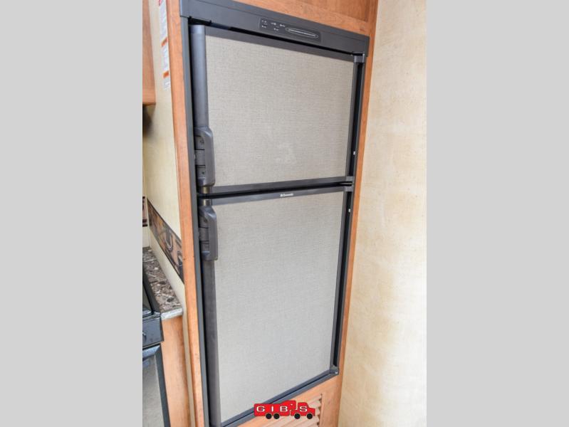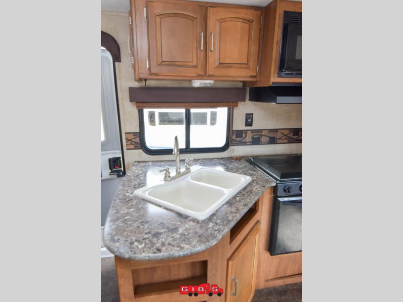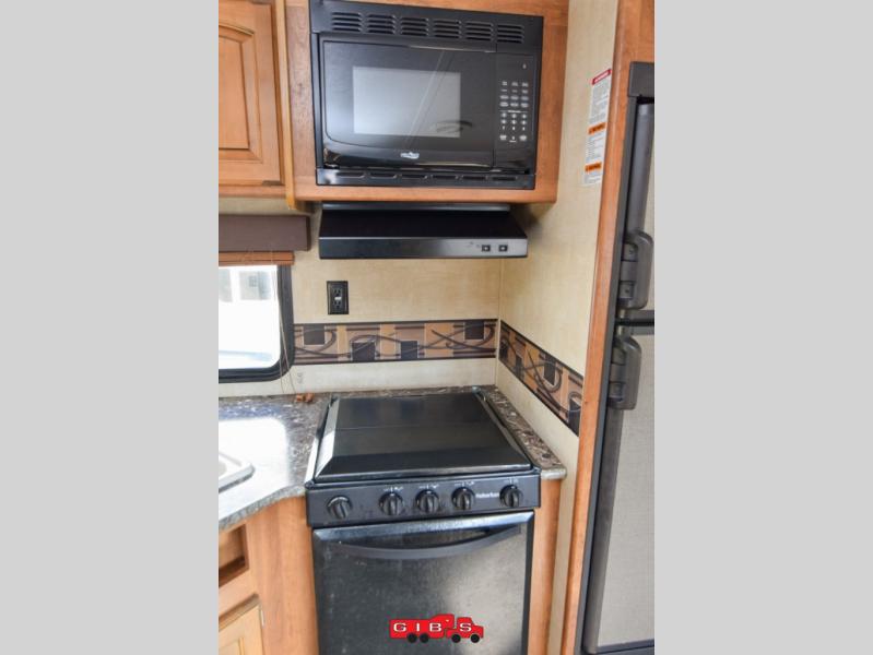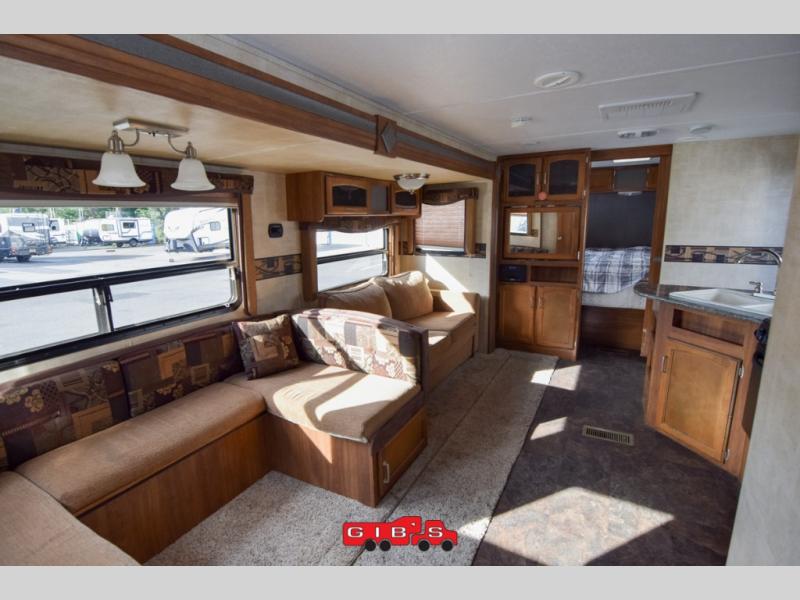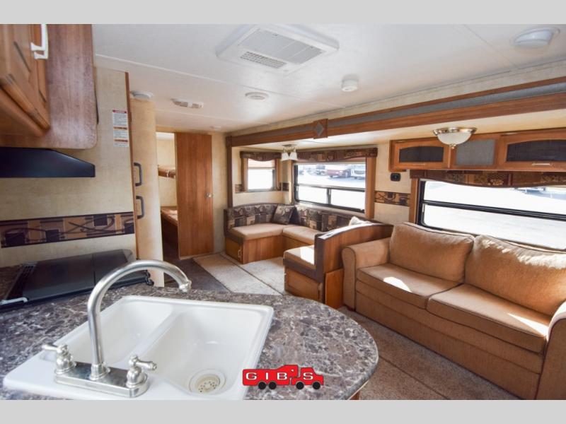 Just outside the bedroom door is an LCD TV for your enjoyment. Nearby is a slide out sofa with storage and a u-shaped dinette featuring plenty of seating for everyone during meals. The kitchen opposite features a large sink, three burner range, and refrigerator.