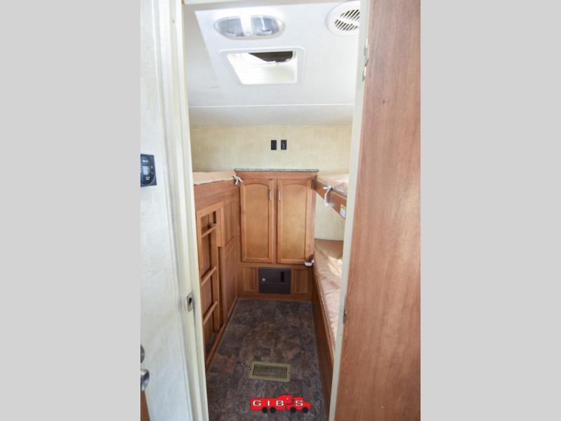 The rear private bunkhouse features a set of bunk beds on the right as you enter, and a entertainment center with bunk above on the left side. There is a wardrobe between the two, and an outdoor kitchen beneath the bunk with the entertainment center.
