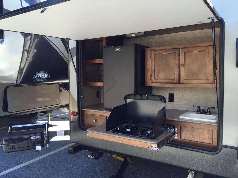 What I liked most: Very well done outside kitchen area with sink, cabinets, medium fridge, drawer, cooking space, and optional grill attached to back bumper. Master bedroom has wardrobe on either side of the bed plus a little pullout drawer under that as well. The headboard area has a really nice nightstand function with outlets on either side for digital devices. The bedroom also feels very private in this layout because of the presidential style hinged door. Nice big island kitchen with plenty of counter space, room to cook, and cabinetry. Private bunk bed area in the rear of this model. Not much storage but a place for four to easily sleep. Digital device charging center is a nice touch in the bunk area.