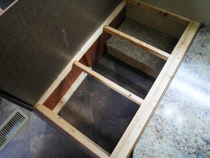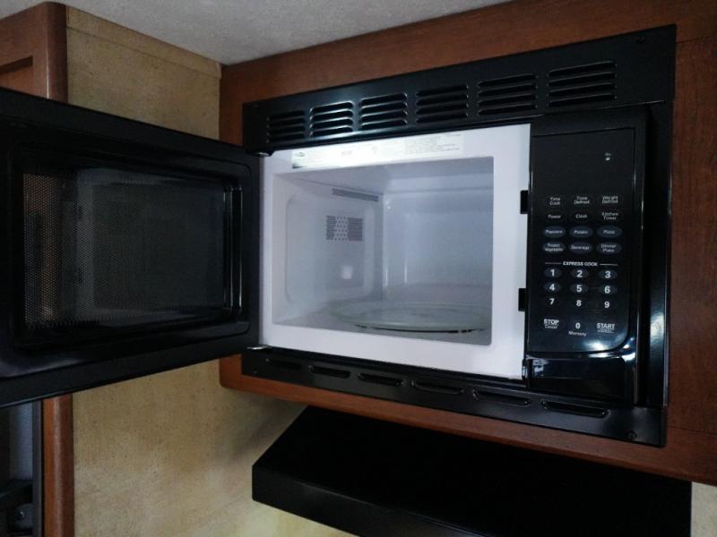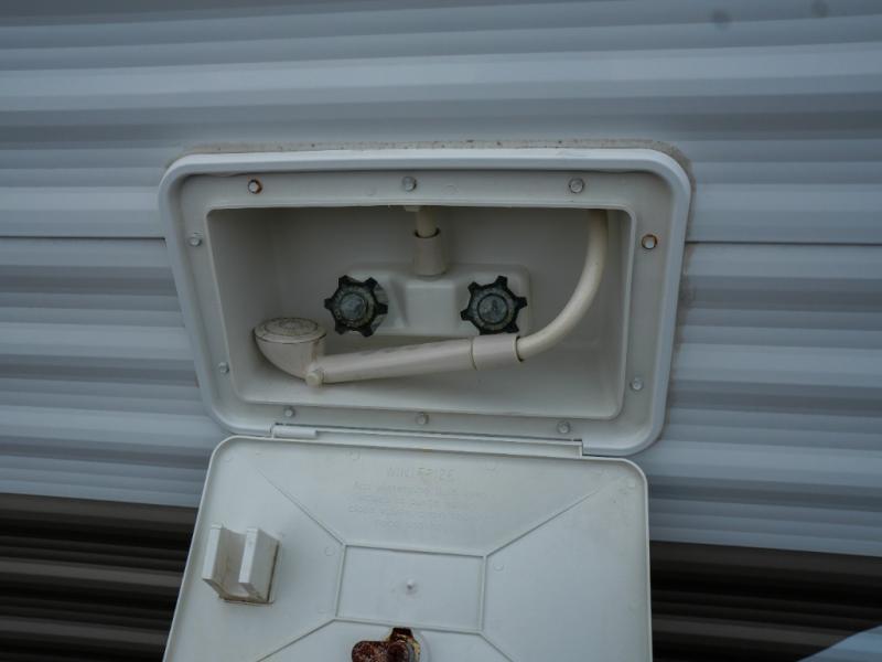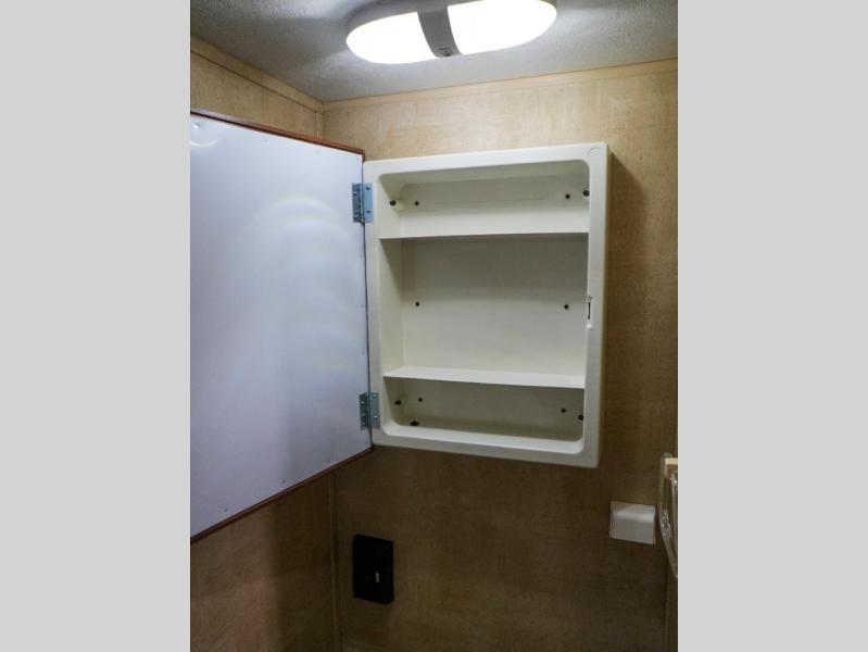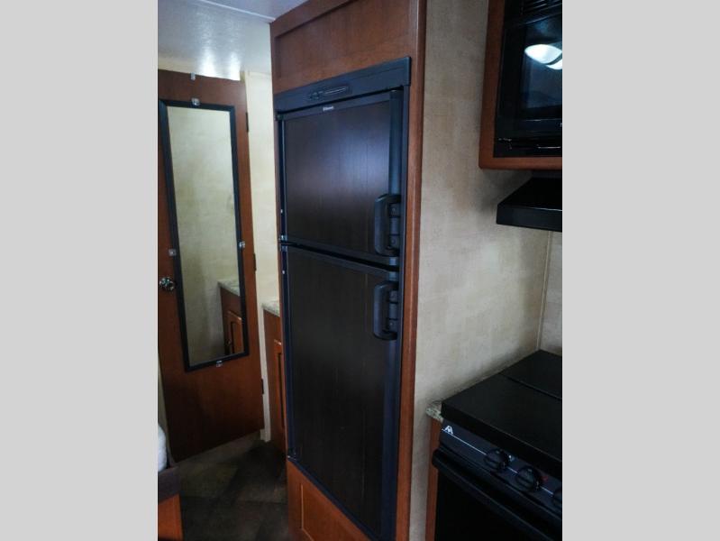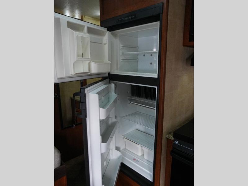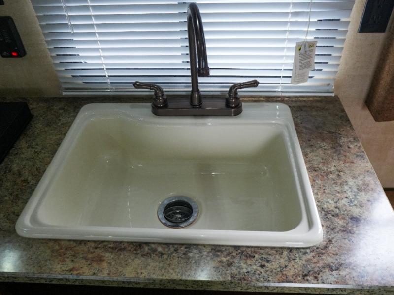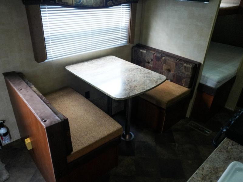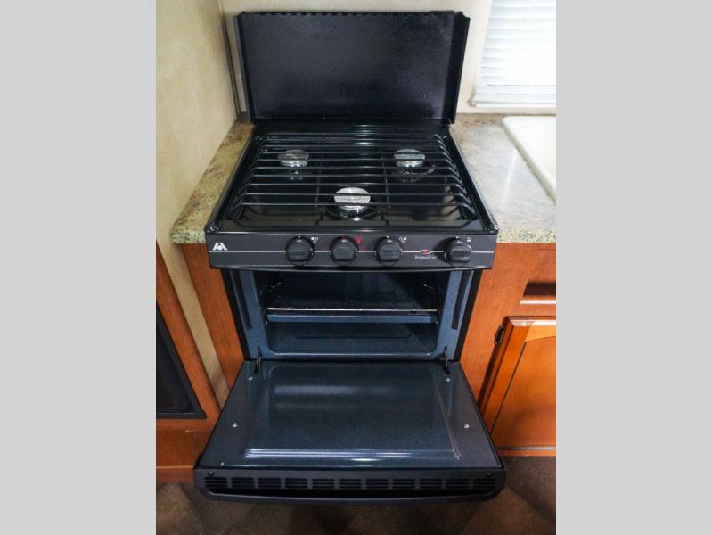 A booth dinette provides a place for dining and playing board games, plus it too can be made into additional sleeping if needed by folding down the table. Across from the dinette is a refrigerator, three burner range, and large kitchen sink making cleanup a cinch. There are overhead cabinet for dishes and things.